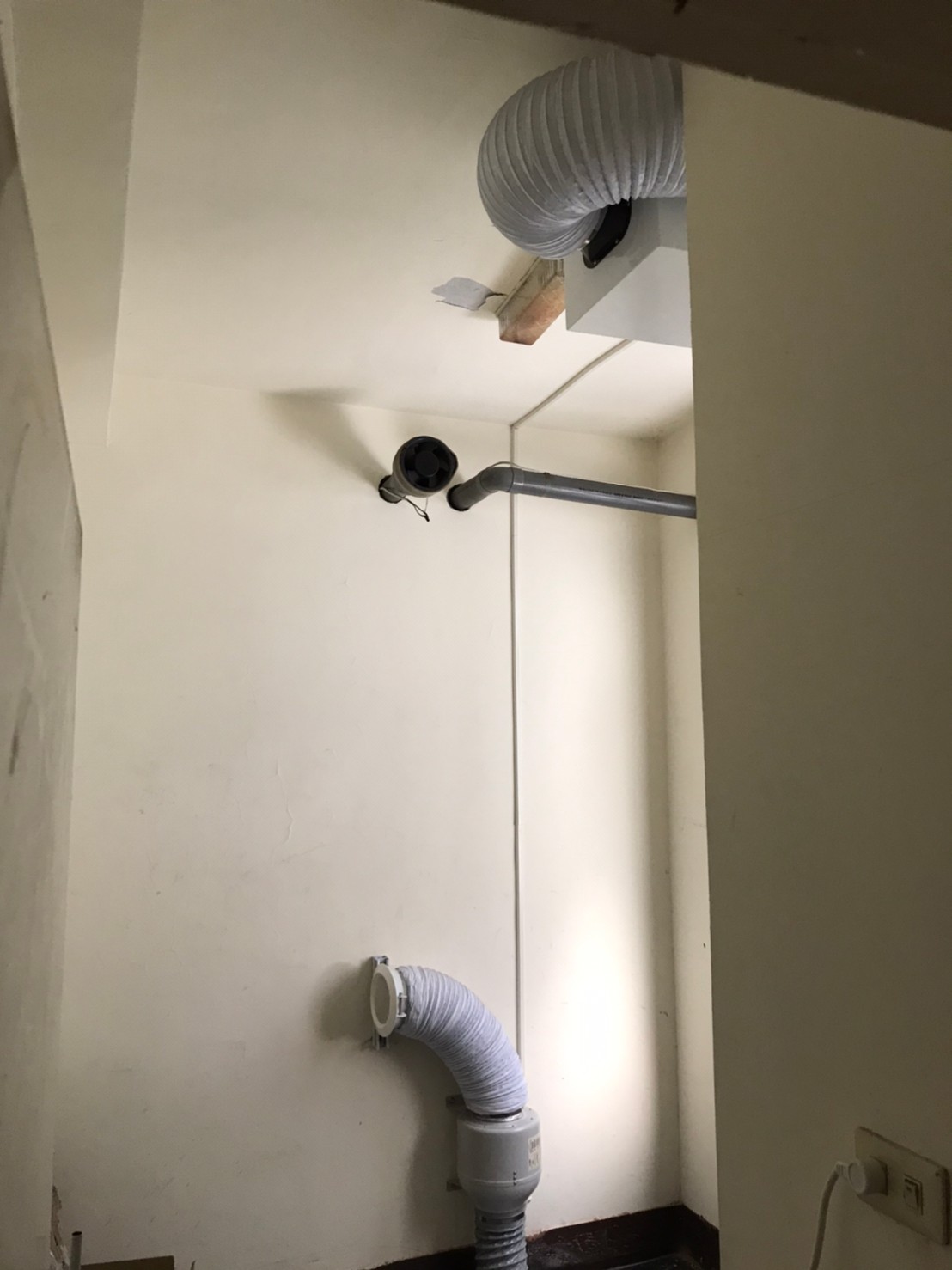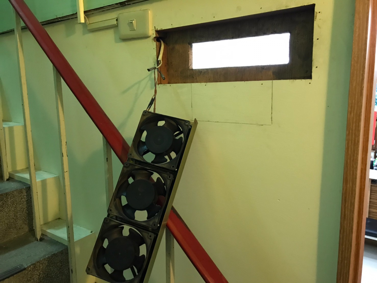 如上圖,此間倉庫下方既為診間室,因此選定這間做為空氣的轉運站,用清淨機H500帶入乾淨空氣到此倉庫,再以6吋風機穿過地板,將乾淨空氣送入樓下的診間