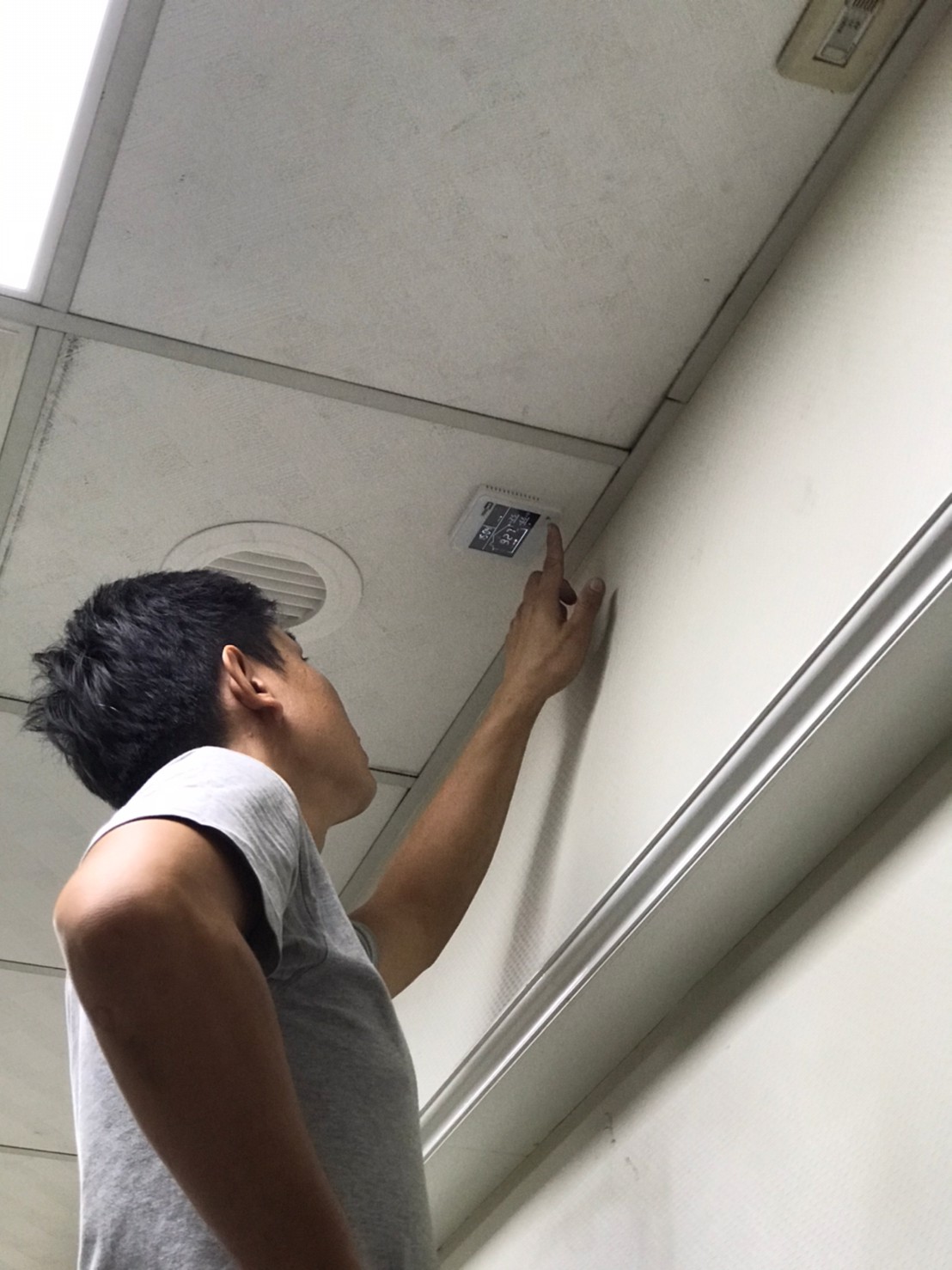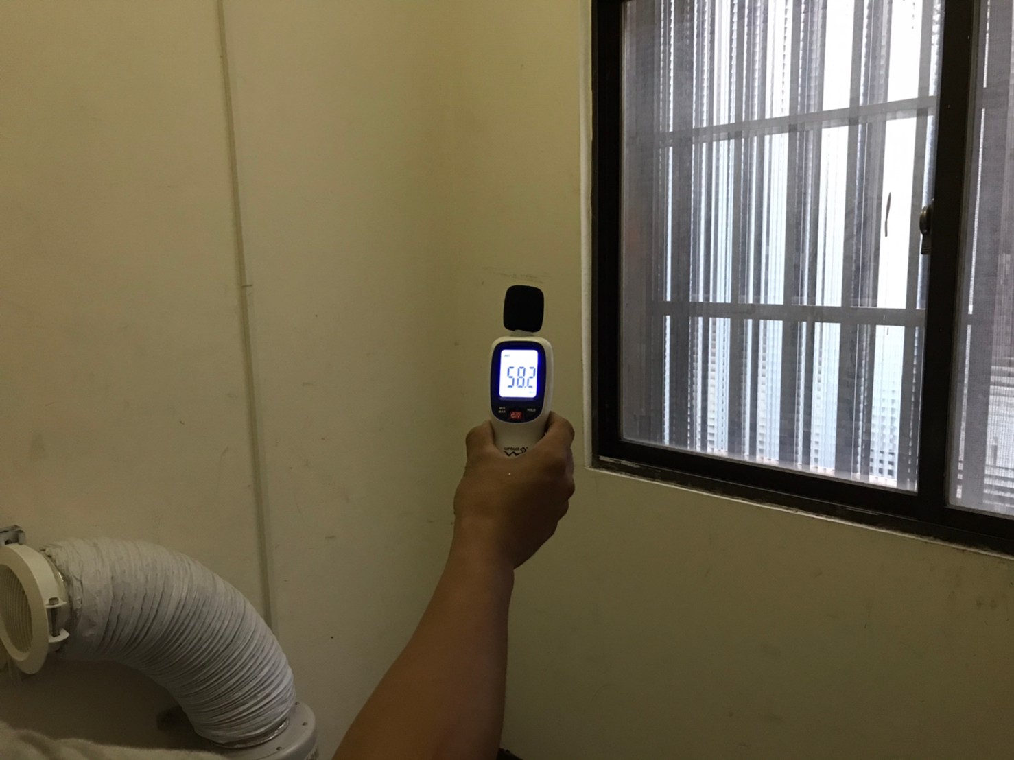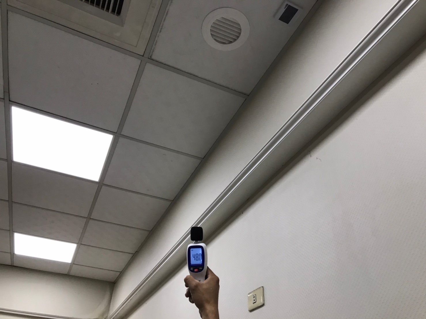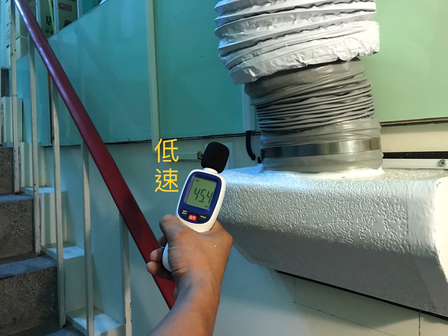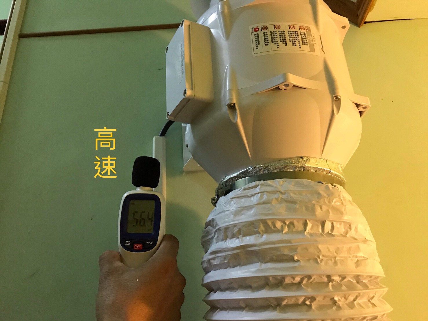 安裝之後嘉定也測試了設備所產生的噪音,近距離測試高、低速運轉皆在60分貝以下,另外藏於天花板的設備分貝機所接受到設備噪音幾乎為零,只有環境噪音(分貝機上所顯示的是環境噪音,例如天花裡的冷氣空調、戶外的馬路車輛噪音…….等等),而在倉庫位置兩台設備同時運轉,分貝數值也僅有58分貝。