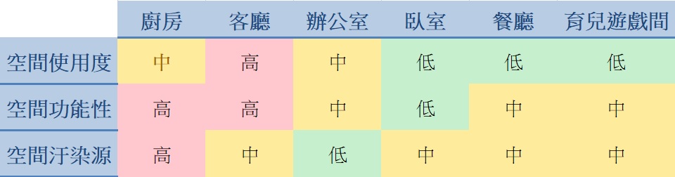 從表格中可以歸類出空間的需求,汙染源越多、功能性較高的空間需要負壓