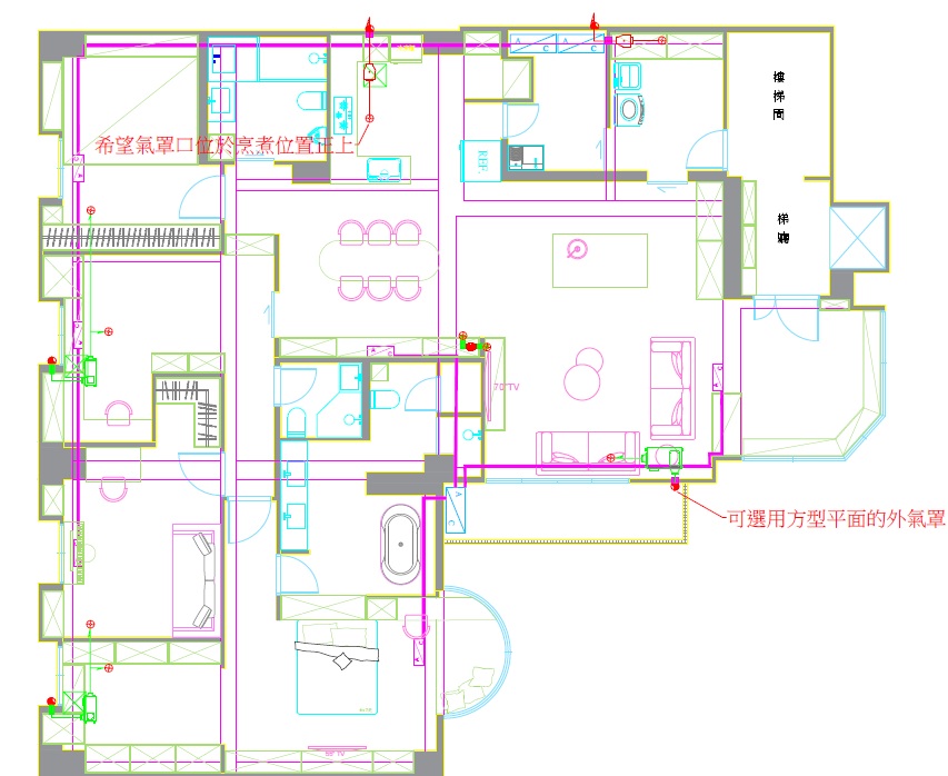 達到健康空氣原則:降低產生的污染,同時也讓客廳的空間保持乾淨空氣,設定足夠的進氣量,而活動空間與臥室空間,也以過濾後的戶外空氣導入,為圖中左邊兩台綠色的標示,因空間面積不大,因此使用一台輸出兩空間的選擇。
