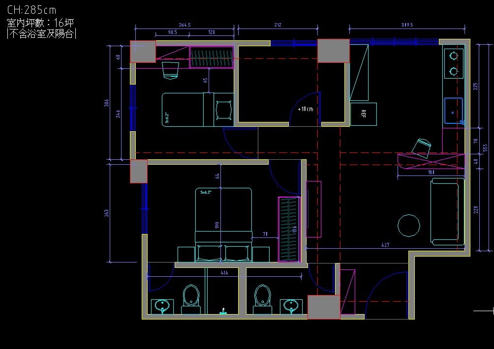 關於臥室居住與室內空氣的關係,僅有產生CO2(二氧化碳)此項汙染,因此在此案臥室的空氣設計上,只需要一台設備,將客廳的乾淨空氣分一些給臥室即可。