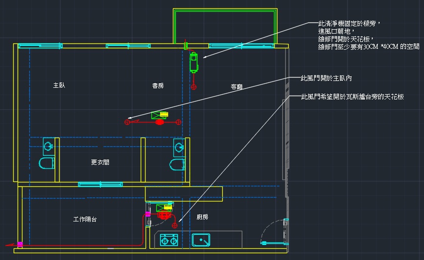 達到健康空氣原則:降低產生的污染,同時也讓客廳的空間保持乾淨空氣,設定足夠的進氣量,而活動空間與臥室空間,也以過濾後的戶外空氣導入,為圖中左邊兩台綠色的標示,因空間面積不大,因此使用一台輸出兩空間的選擇。